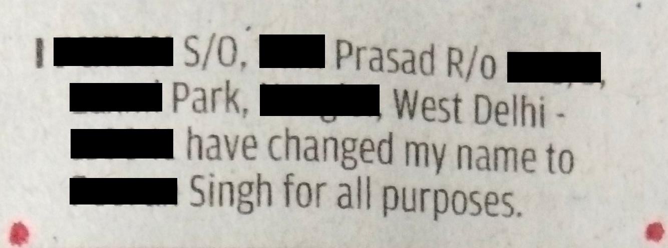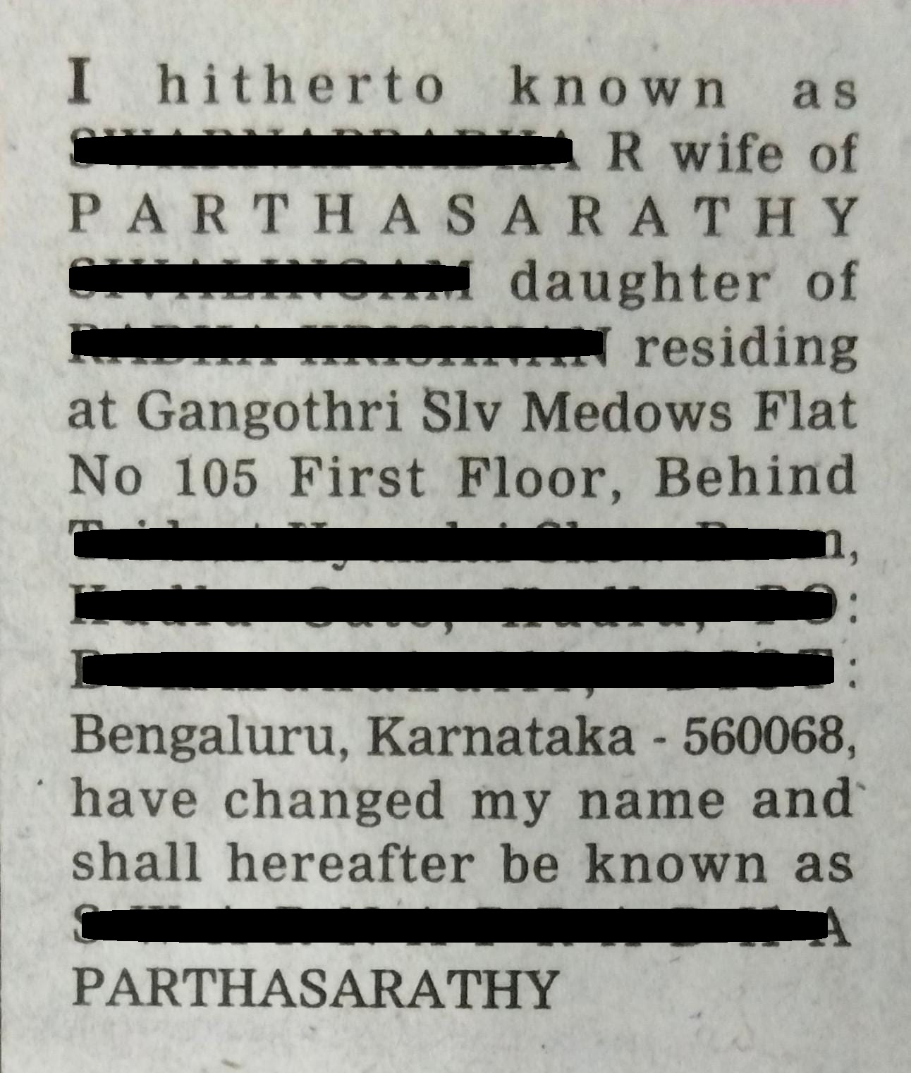 In India, changing your name requires drafting an affidavit, publishing it in a newspaper, and getting a Gazette Notification.